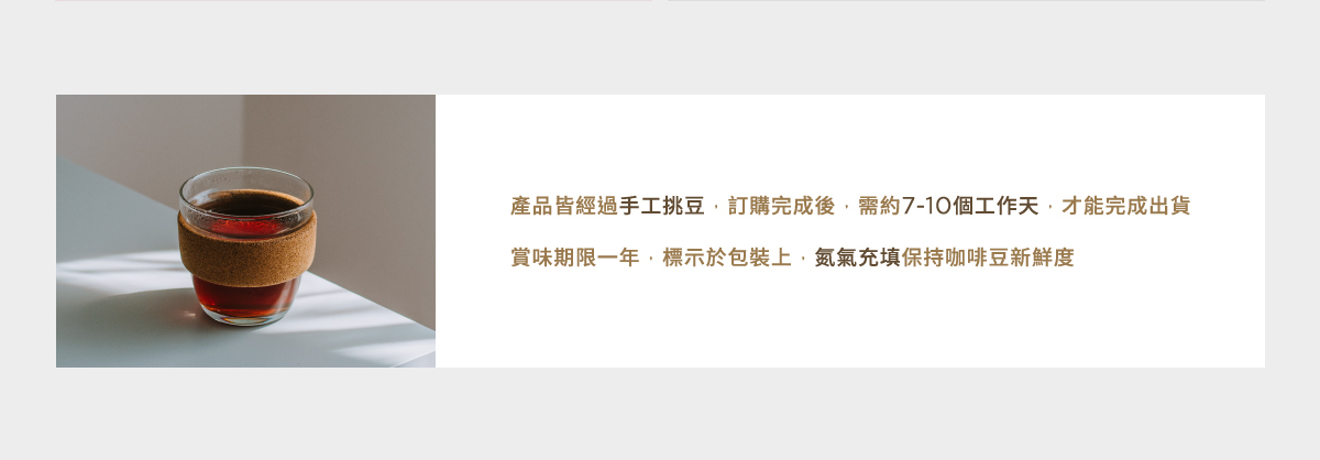 製造日期:打印於包裝上,氮氣充填保持咖啡豆新鮮度