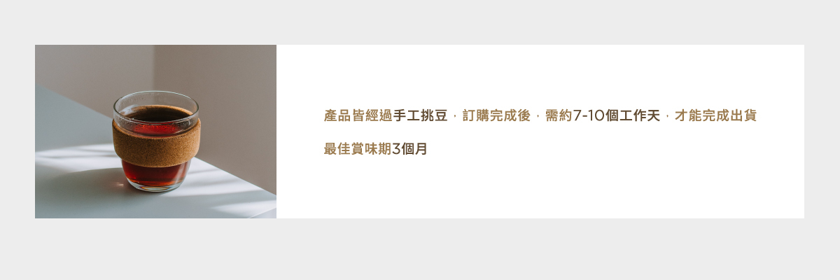 ◆製造日期:標示於包裝上,採接單後烘焙,保持咖啡豆新鮮度